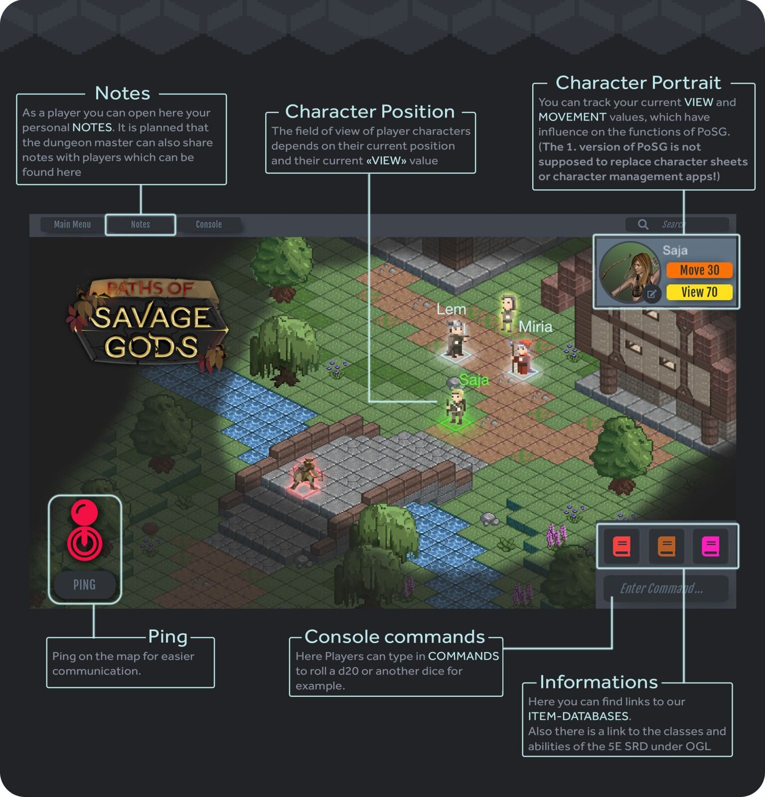 If you’re a player, you’ll need to pair Paths of Savage Gods with your favorite character sheet app such as D&D Beyond or Reroll. In Paths of Savage Gods, players will only be able to see their position on the map, make rolls, make notes, etc. Down the line, it may include integrated character sheets, but that is not available yet.