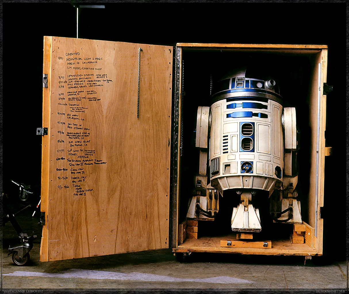This is a way cool photo of R2-D2 in his shipping crate. One of the things that I like most about it is the timeline on the open door. It reveals the different set locations and different movies that this particular droid was a part of. As you can see, the oldest date written down is 1997, so that tells us this was used in the prequels. That may make the photo slightly less special, but it's still cool!