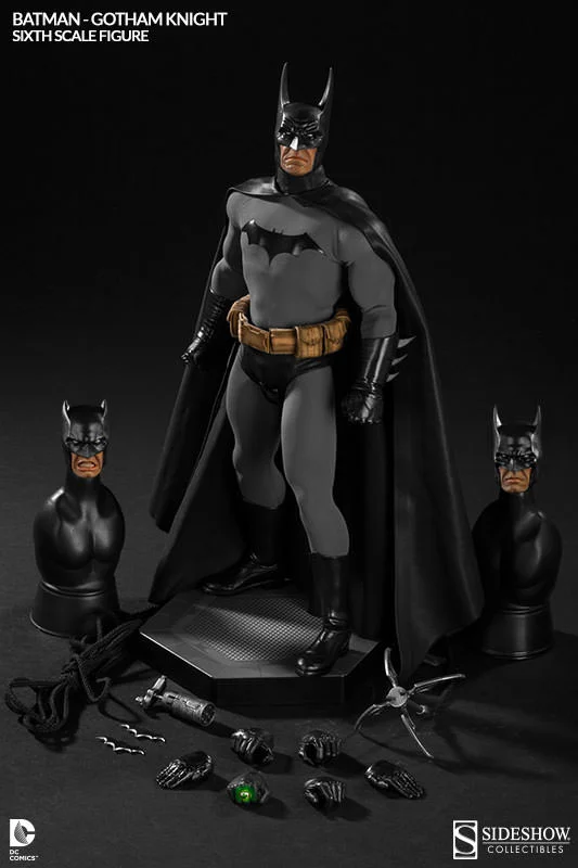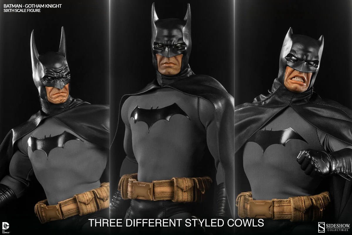 Crafted with meticulous attention to detail on a fully articulated muscular body design, our hero is disguised in a grey and black tailored Batsuit and cape. Inspired by a number of timeless comic book appearances, the Batman ‘Gotham Knight’ Sixth Scale Figure invites collectors to further define their favorite look for the Caped Crusader with three cowl and mask options, and three interchangeable facial expressions, which are also compatible with Sideshow’s Batman Sixth Scale Figure.