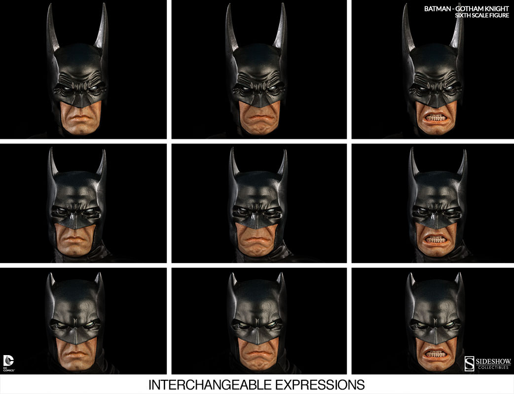 Sideshow Collectibles has revealed a new 1/6th scale action figure of Batman. The "Gotham Knight" figure has several Batman faces and cowls to choose from. One thing that the faces all have in common is that they all portray him being ultimately pissed off.