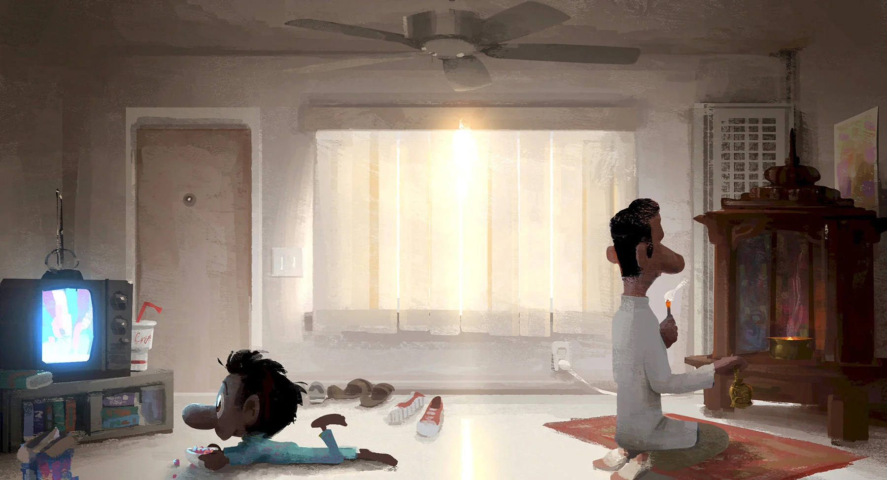 The seven-minute short begins with young Sanjay watching cartoons and eating cereal in a bland, beige room as his father jingles a bell, beckoning him to join in meditation. Reluctant and bored by the ceremony, Sanjay begins daydreaming a kind of ancient, Hindu version of “The Avengers,” with the gods appearing like superheroes. As the daydream progresses, the color, light and animation of the film grows increasingly dazzling and cosmic, and Sanjay grows closer to understanding his father’s inner world.