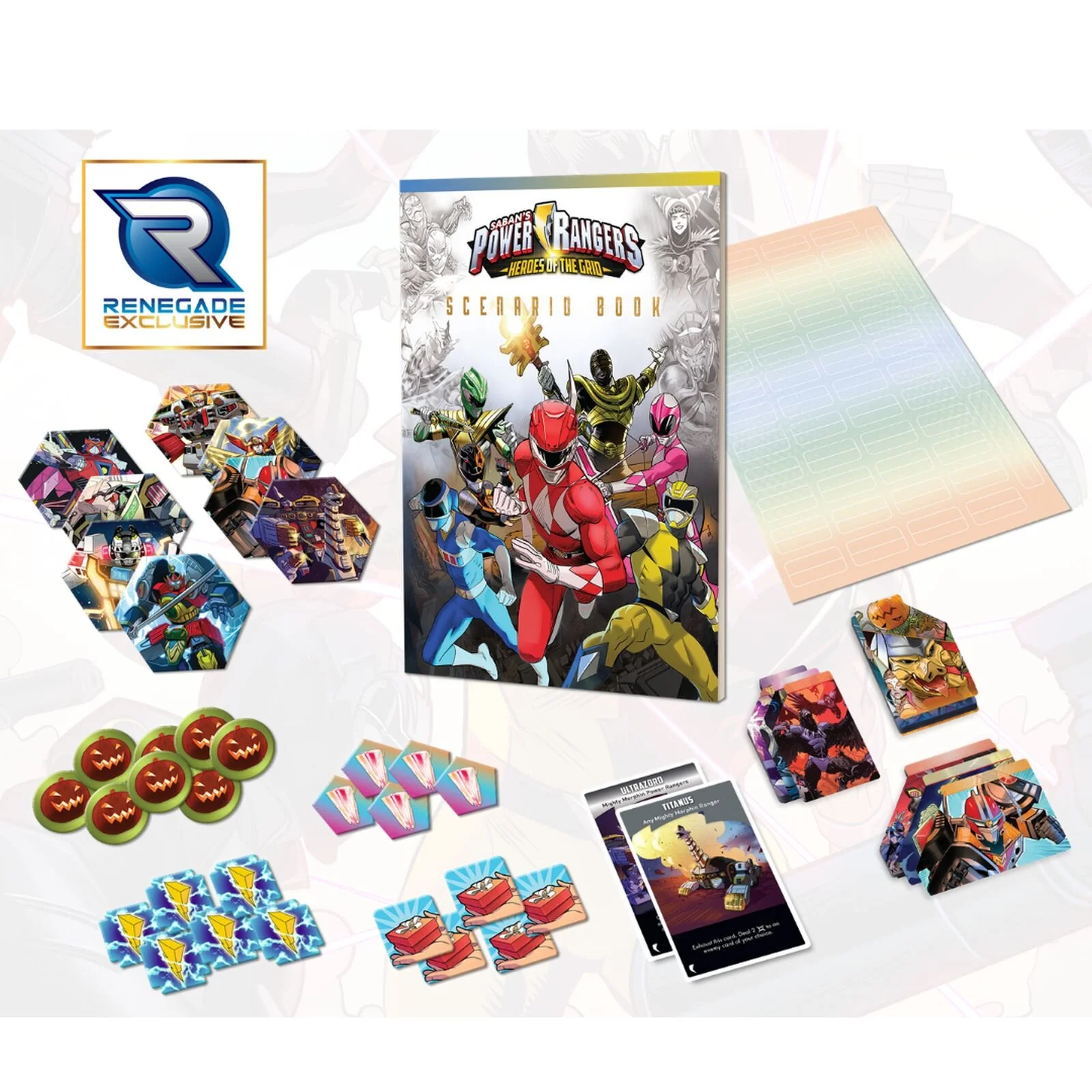 The kit comes with a scenario book featuring the free scenarios #0-12, Titanus, Ultrazord, 8 Patch tokens, 6 Gift tokens, 8 Megazord tokens, 6 Player Life tokens, 5 Zeo Crystal tokens, 20 Ranger dividers, 15 Monster dividers, 5 Boss dividers, and a card divider sticker sheet. This is a $20 value added on for free to bundles.
