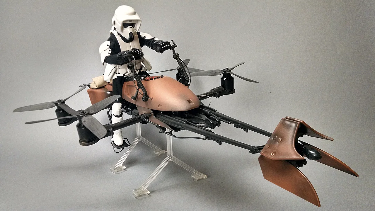 We've previously shared some awesome videos featuring a remote control versions of the Star Wars TIE Fighter and the Millennium Falcon. Today we have a new one for your viewing enjoyment. This one shows us a quadcopter Speeder Bike created by Adam Woodworth. It even has a Scout Trooper riding it! These are the kinds of toys that Disney should be making for Star Wars!