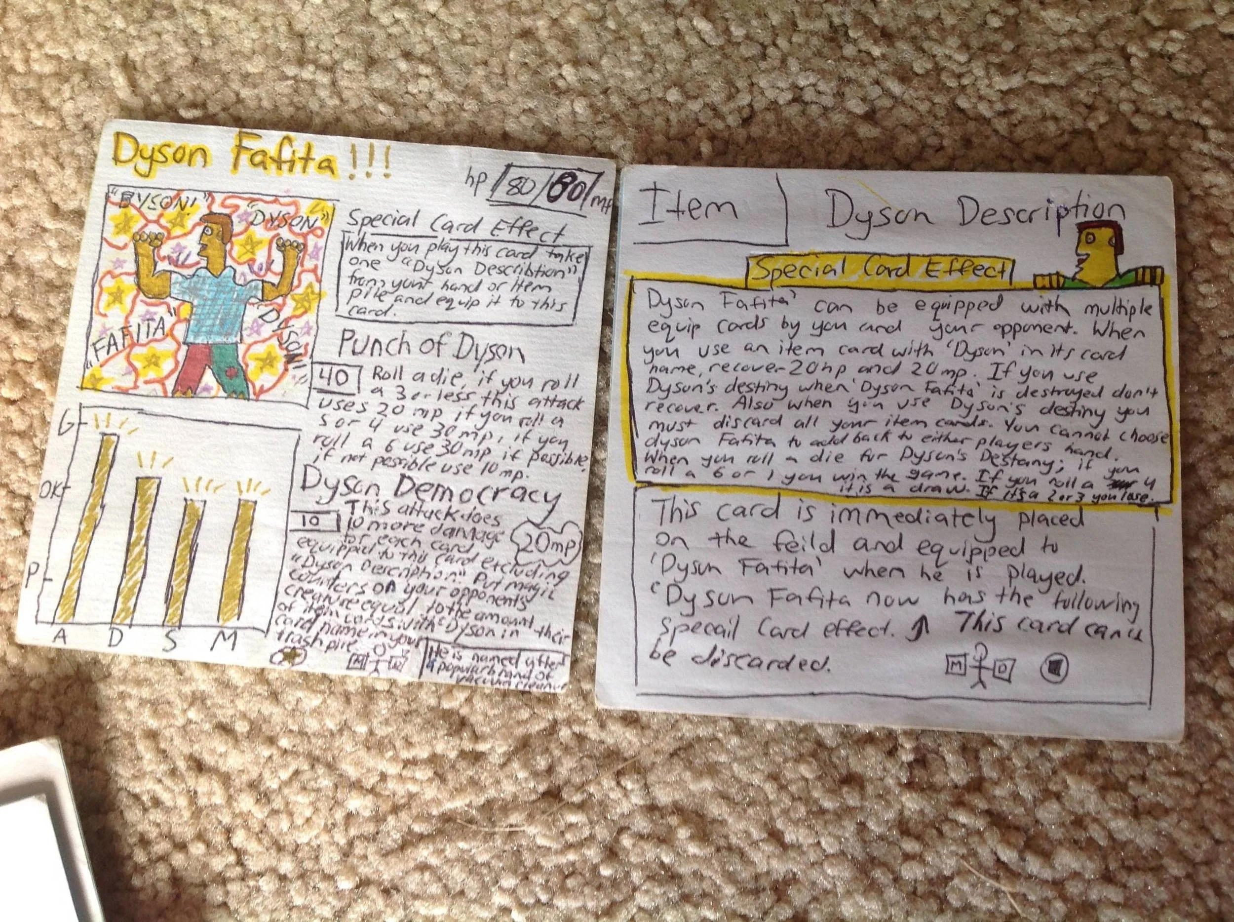 Dyson Fafita. The design is based off the Troy McClure from the Simpsons and the name is from the vacuum cleaner brand, Dyson. There was too much writing to fit on one card so we had to make another card for his special card effect