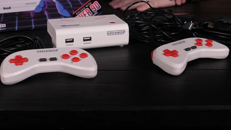 Inside the box we have the Super Retro-Cade console, which shares an identical design to 2016’s Retro-bit Generations micro console. This time around the Retro-Cade sports a white with red accents color design instead of black. The whole unit is nice and compact featuring a footprint around the size of an NES Classic Edition. The power button lights up when the unit turns on, providing a nice red glow that fits with the color scheme. The front of the unit features a clean design consisting of 2 USB ports for the included controllers -more on them in a bit- and a Retro-bit logo. The back of the unit features an SD card port that allows users to copy saves and save states from the Retro-Cade that can then be used on other Retro-Cade units or PC emulators. AV options for the Retro-Cade include composite and HDMI ports which are also found on the back of the unit.