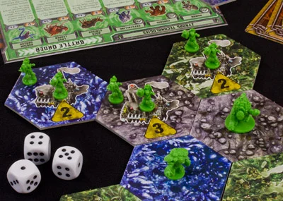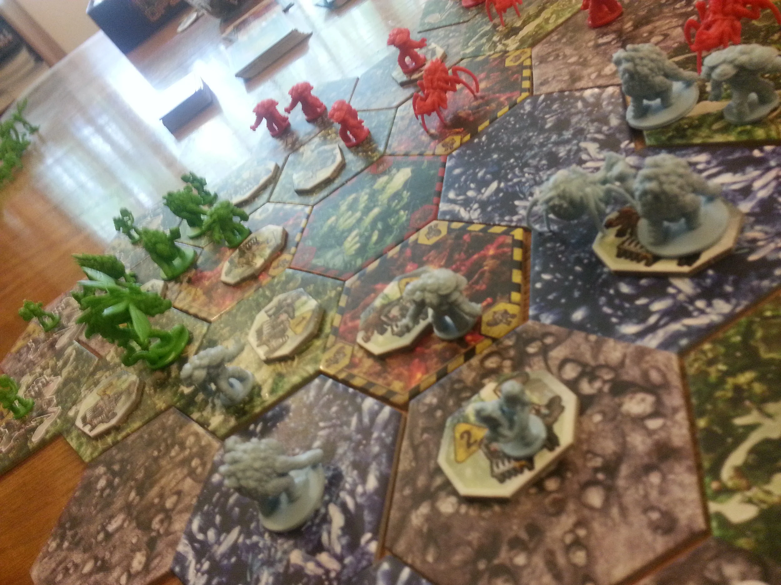 Now this is a combat intensive game, so how about we get to the meat and potatoes portion of it? Combat goes pretty quickly once you get going, and is a combination of dice rolling and adjusting to terrain effects. Each unit has a combat value, and that determines how much it takes to hit the other person, as well as its defense. If 3 players have a unit each in the hex, player 1 can attack player 2’s unit, win, and even though player 1 won that particular battle, the hex is still contested, since player 3 is still there. The game heavily skews towards the aggressor when it comes to sector control and battle, as there is really almost no reward for just holding or defending what you have. If a defender loses all of his units in a sector, he gets an energize card, but that is it.