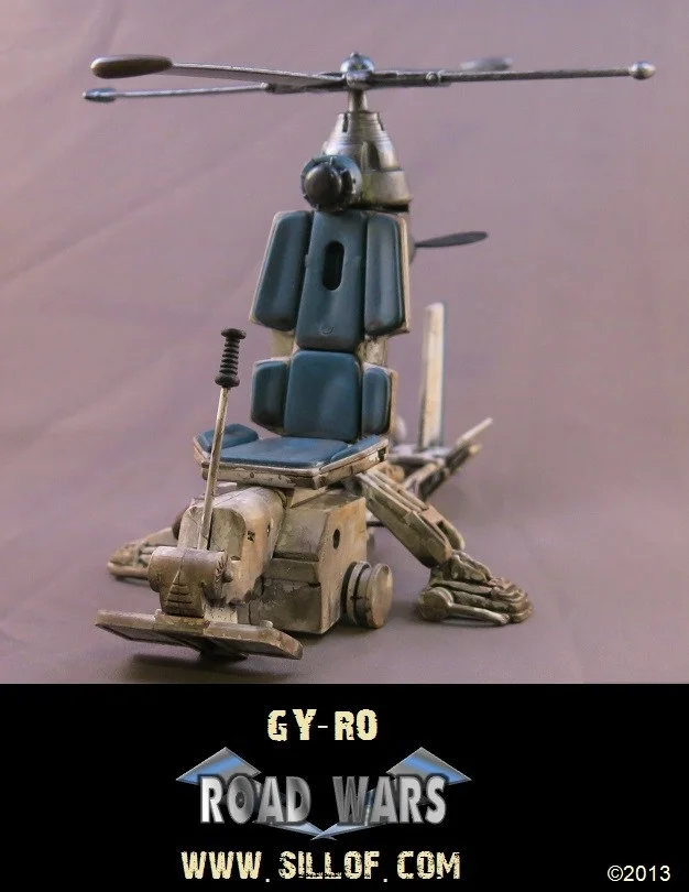 Cptn.’s little friend was his homemade flying contraption called a Gyrocopter or GY-RO for short, that was harnessed to the trailer. The gang had taken Cptn. and the copter as a prize for their leader. The engine runs on a new type of synthetic fuel that can be made and not harnessed from the ground and refined. Hal fixes the trailer to his car and realizing he has something of value in the two. Hal took them towards a small settlement with hopes to barter them.