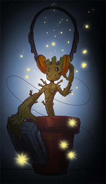 Groot from Guardians of the Galaxy is rockin' the '80s tunes in this fun fan art created by Augie Pagan. That extra scene of Groot dancing at the end of the movie really seemed to resonate with audiences. I'm so excited to see what's in store for these Guardians of the Galaxy in the sequel. We've got a long way to go, but it's coming.