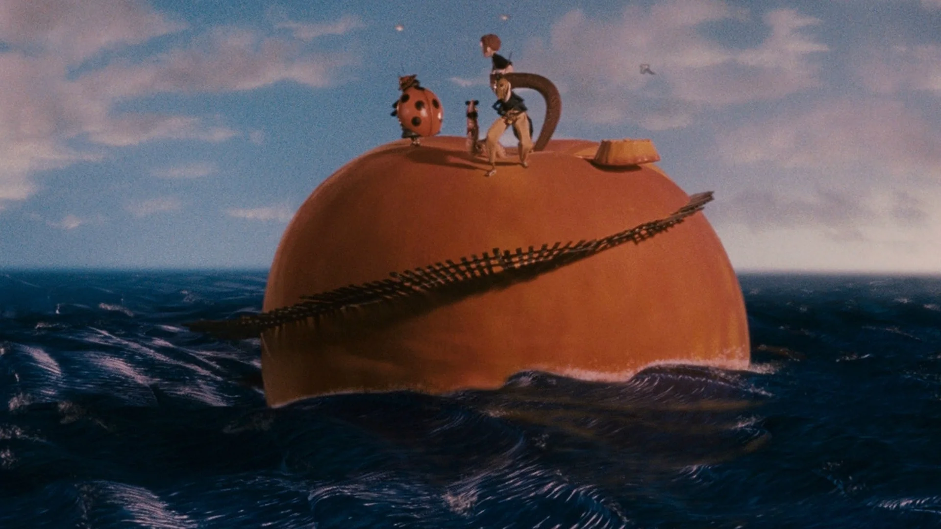 James and the Giant Peach centers on an orphan who is forced to live with his cruel aunts. "James finds a way out of his bleak existence when he discovers an enormous enchanted peach. After rolling into the sea inside the buoyant fruit, James, accompanied by a crew of friendly talking insects, sets sail for New York City."