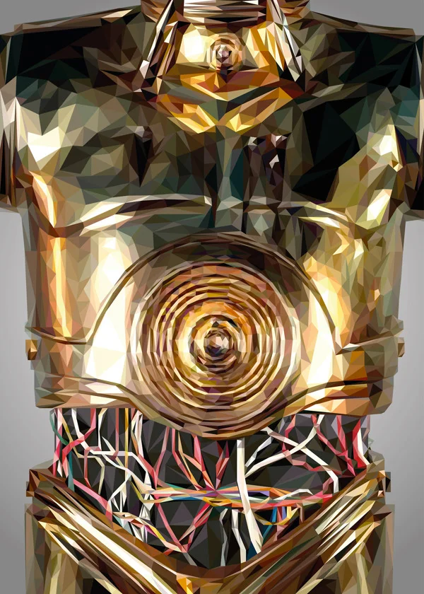 Artist Simon Delart took an interesting route when crafting this series of portraits that feature characters from the Justice League, Star Wars, and, holding it down for the half-human robots, RoboCop. The artist focused only on the mid-section of each character for their portraits which are made up of thousands of triangles. We’ve featured Simon’s geometrical designs before, but I believe this is the first time that he’s numbered the amount of triangles he used to create each piece. I'm wondering, did he sit there and count those things??? That would be very tedious and time consuming work. That may explain why he didn’t bother numbering the amount of triangles used for the most recent set of portraits featuring the Justice League. I’ve included the numbers he did provide below the portrait. If you want to help Simon out, feel free to count the triangles on the JLA pieces. I’m sure he’d appreciate it.