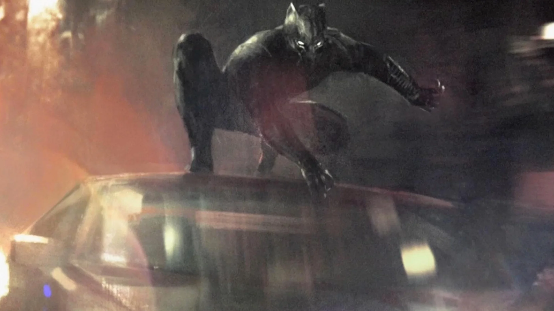 We've also seen concept art from this scene that you can see above featuring Black Panther on top of a car, which is exactly what you'll be seeing in the video and photos below. Black Panther is all decked out in his costume and holding on to the top of a car.