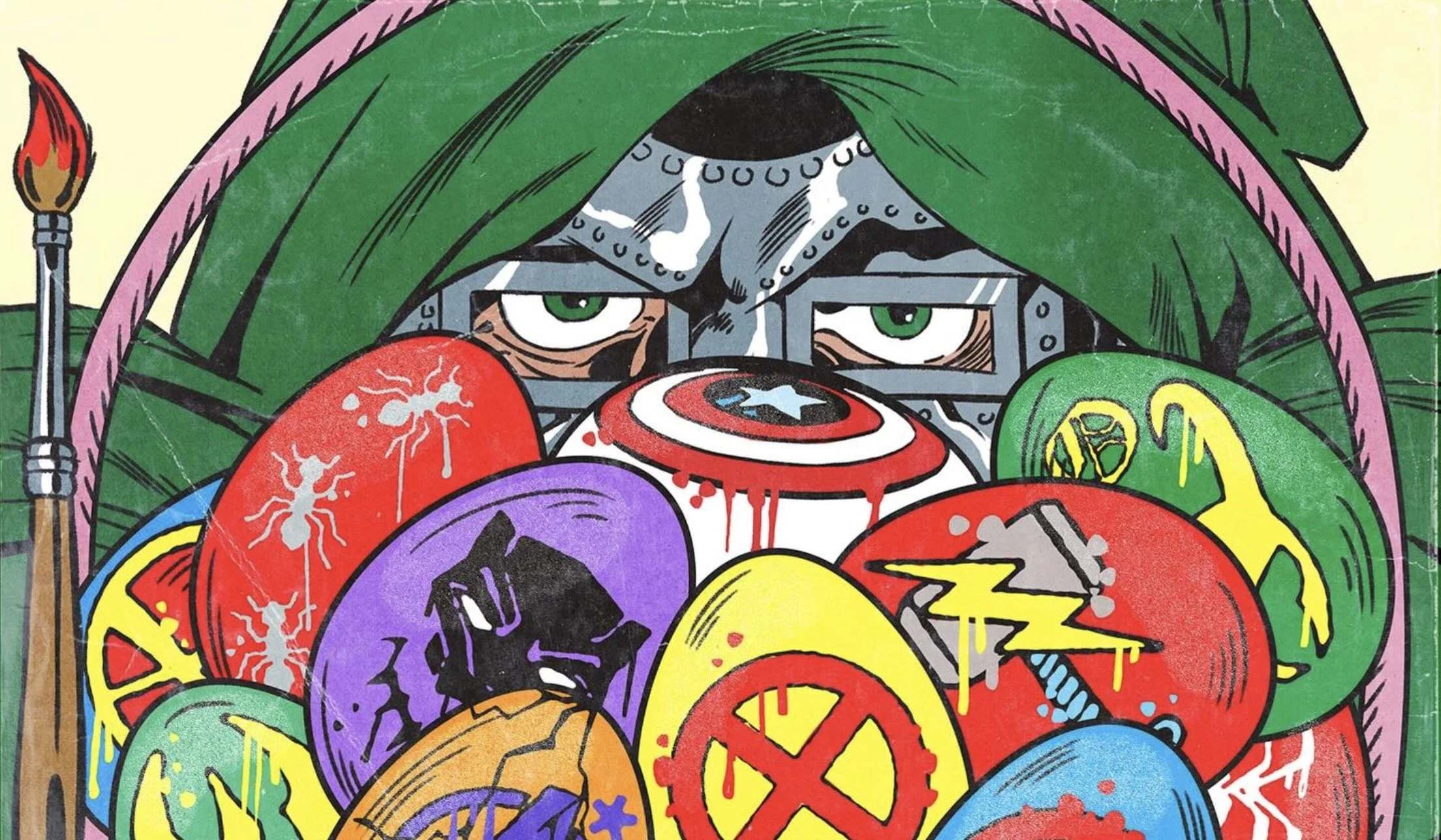 Alongside the illustration are images of characters tied to each egg, including Shang-Chi, Cyclops, Thor, Sam Wilson’s Captain America, Shuri, Doctor Strange, Ant-Man, Loki, Reed Richards, and notably, Spider-Man.