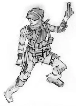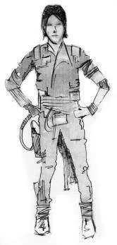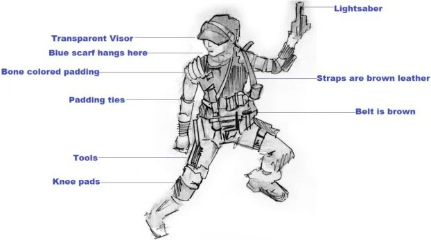 "I had trouble with the loose free-flowing scarf, so I didn’t depict it. She has a ton of detail and gadgets on the costume, so please forgive me for any ambiguities. The pants reminded me of Boba Fett’s pants (they’re not). The knee pads, chest and scarf are a dark blue. The pants are grey. Her arms are a white 'bone' looking padding, tied off with brown straps. My sketch looks like she has a hat brim but that is supposed to be a transparent visor. It’s like a solid piece of glass or plastic and you can see her eyes through it. The stances below are nearly identical to the art I was shown.
