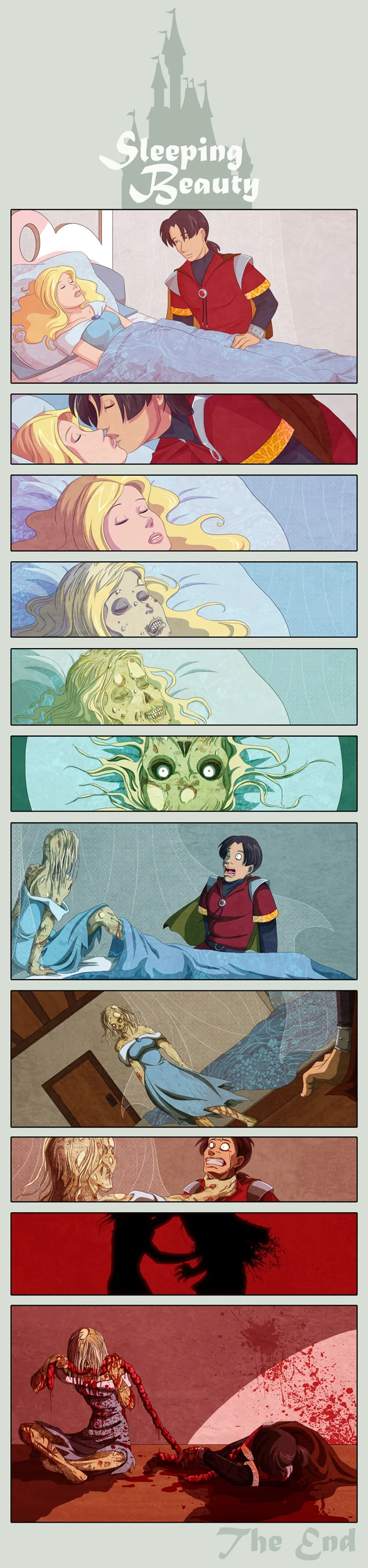 The artist who made this, Sarah White, goes by the name Shira-chan on Deviant Art. She seems pretty twisted. We love her. Her take on Sleeping Beauty is darker and more fun than Maleficent was. This is why you don’t go around kissing random sleeping princesses, Prince. Serves you right. Let this be a lesson to all you guys out there creeping on sleeping ladies. One day you’ll pay the price.