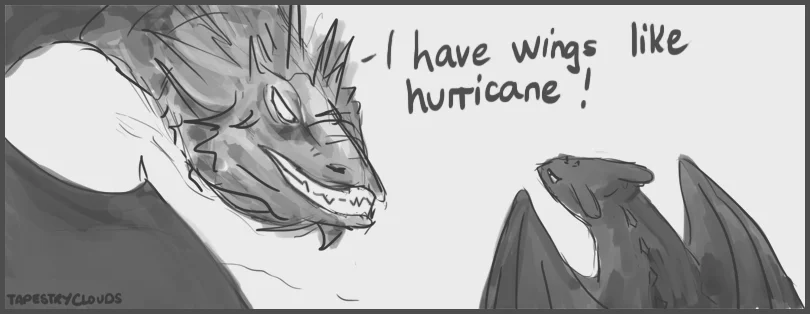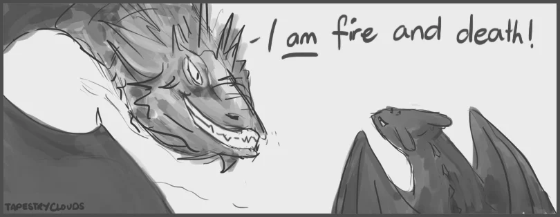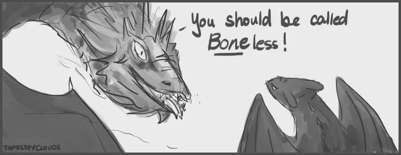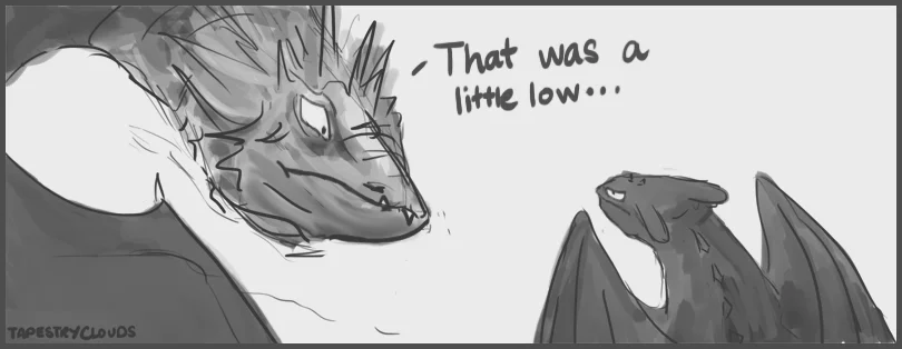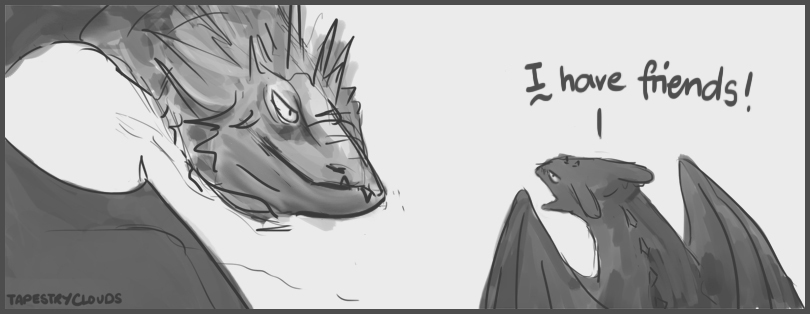 Last week, Smaug went on the Colbert Report to promote The Hobbit: The Battle of the Five Armies, which opens today. During the interview, it was brought up that not all dragons get bad press and that Toothless, from How to Train Your Dragon, is a hero. Smaug proceeded to tear down Toothless, retorting, “Toothless? More like ball less!” In this comic by Tumblr artist Tapestryclouds, Smaug continues his smack talking, only this time Toothless is there to dish it right back. Smaug’s scales are indeed impervious to most weapons, but he is thin-skinned when it comes to insults.