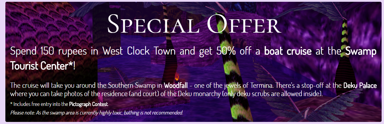 I stumbled upon an interesting link while surfing Reddit this morning. Reddit User /u/sylvrtortus created a tourism website for Clock Town from The Legend of Zelda Majora’s Mask. The site is amazingly detailed with pretty much everything you could expect from a tourism website for a video game.