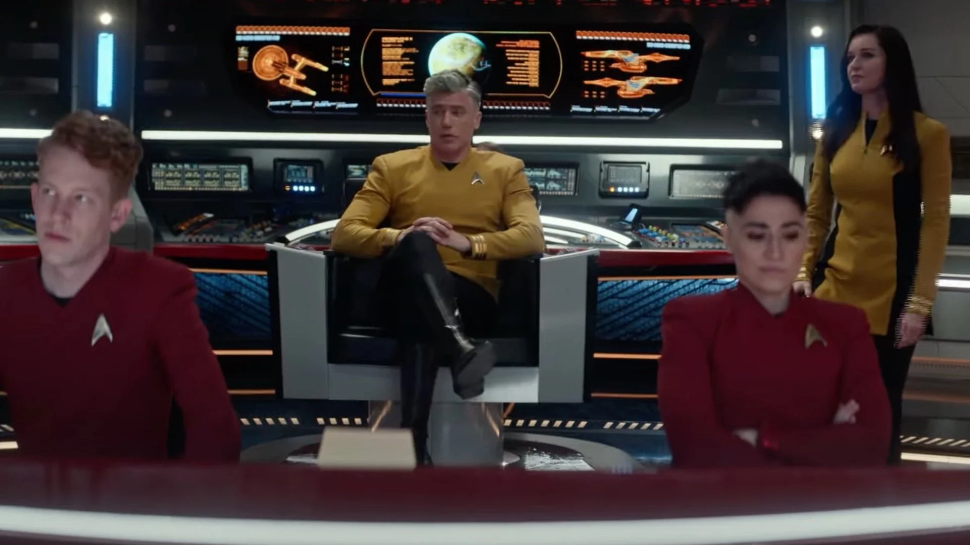 Star Trek: Strange New Worlds stars Anson Mount as Captain Christopher Pike, Rebecca Romijn as Number One, Ethan Peck as Science Officer Spock, Celia Rose Gooding as Cadet Nyota Uhura, Christina Chong as Lieutenant La’an Noonien Singh, and Melissa Navia as Lt. Erica Ortegas.