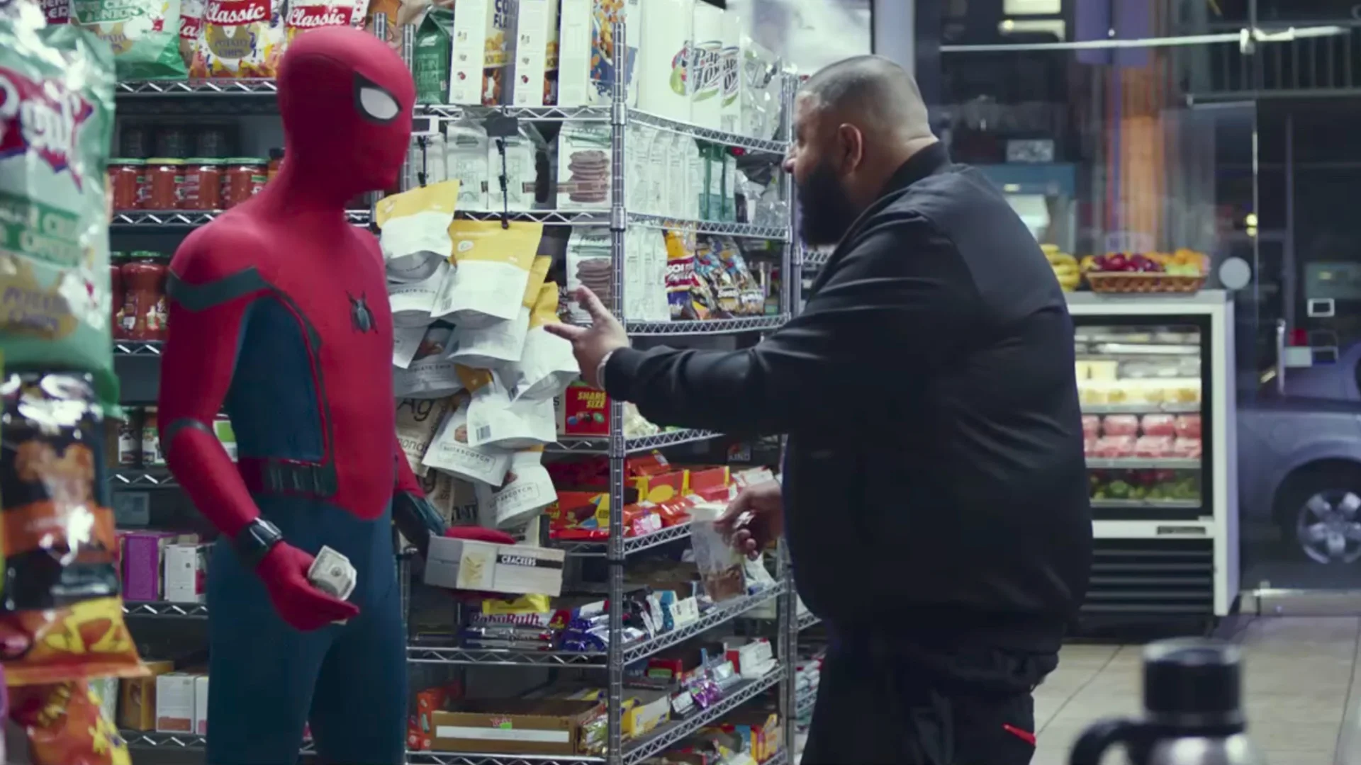 Another new NBA Finals promo spot has been released for Spider-Man: Homecoming. It continues the adventure of Spider-Man as he is on a mission to get snacks for Tony Stark's party that all began in the first promo that you can watch here. In the latest spot, Spidey stops off at a little market where he runs into DJ Khaled, who is also on his way to Stark’s party. He also poses in a photo with some fans.