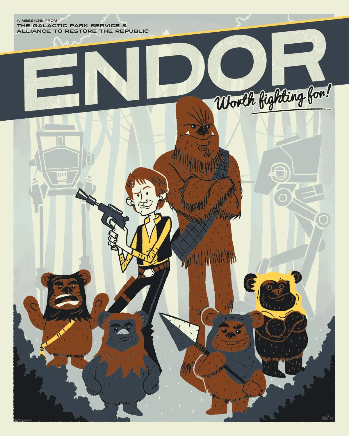 The header image is called “Endor: Worth Fighting For!” by Ian Glaubinger is a 16 x 20 inch signed silk screen print in an edition of 150. It costs $50.