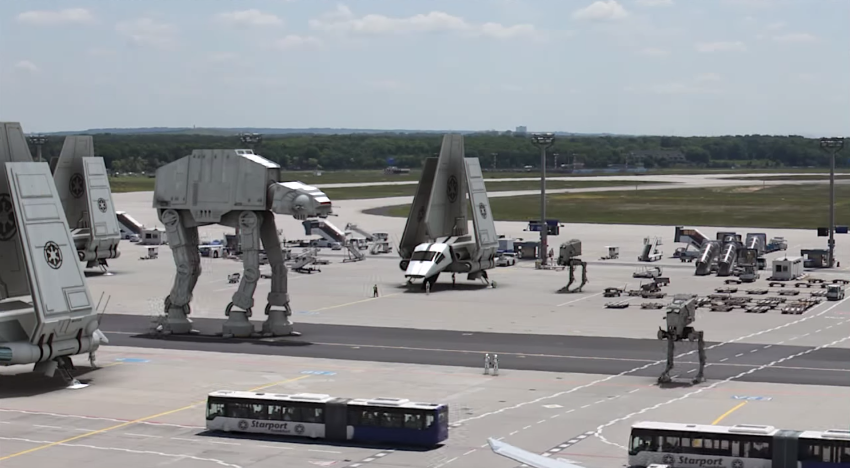 One of our readers sent in this entertaining fan-made video footage from the "set" of Star Wars: Episode VII. The video was created by Frank Wunderlich, and he is having a little fun with Star Wars fans. He basically turned the Frankfurt (Germany) airport, named FraPort, into StarPort. There are a ton of Imperial ships and vehicles for you to enjoy in a real world setting. Here's the note that came along with the video:
