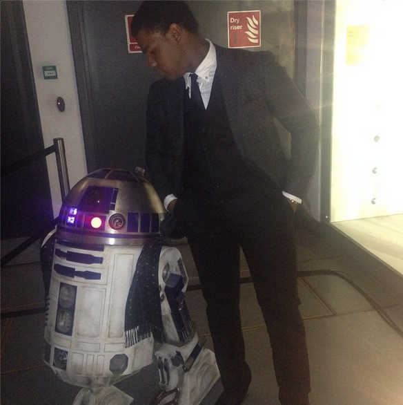 On Saturday, November 11th, the Episode VII team celebrated with a wrap party at London's Science Museum. Many of the film's stars were in attendance including Harrison Ford, Carrie Fisher, and Mark Hamill. Even Simon Pegg showed up. One of the newcomers of the franchise John Boyega also posted a photo above on Instagram of himself and his co-star R2-D2 from the party. You can see the note that the cast and crew got below.