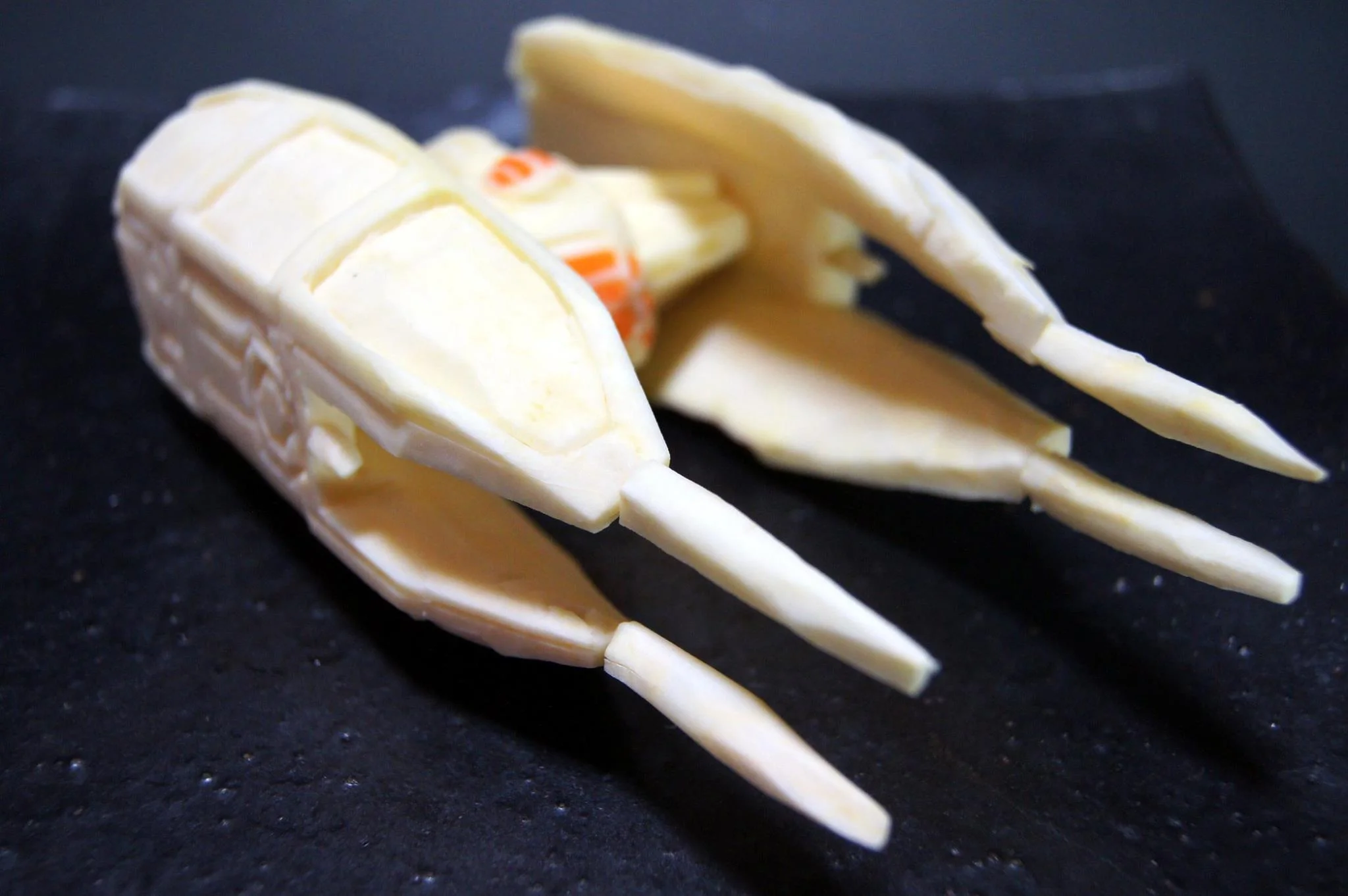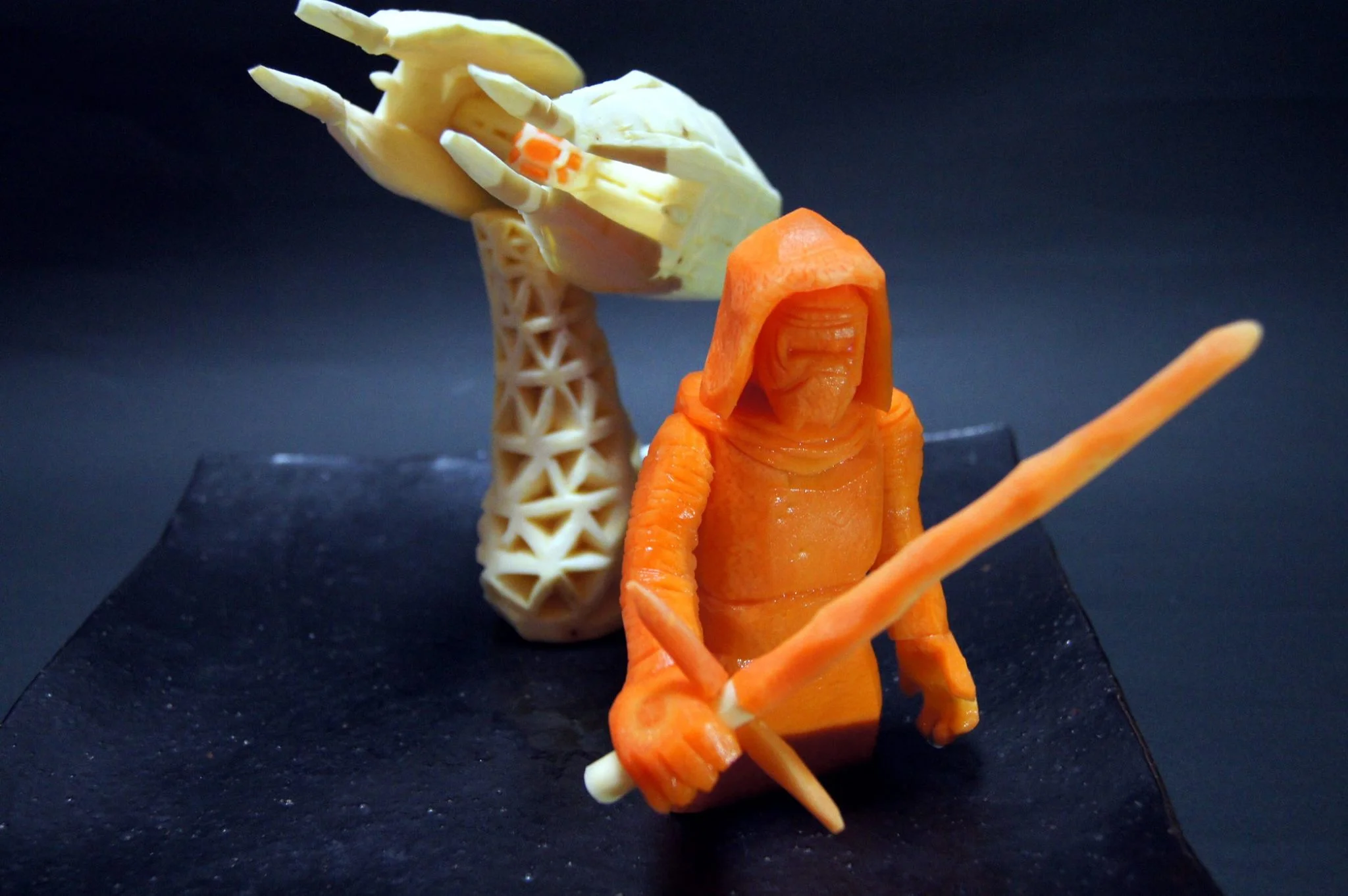 Have you ever watched Star Wars and said, "that looks delicious?" Neither have I. However, these carved vegetables may change your mind. Sushi chef Okitsugu Kado carved some vegetables to look like Kylo Ren and Ren's TIE Silencer. The details are amazing, and I love how the lightsaber is not perfectly smooth similar to the one in the movie. Not to mention the lines carved on his mask. I wish he had carved more of these with the different characters. I’d love to see a Rey carving or a Finn one. Does anyone else want to go rewatch Star Wars: The Last Jedi and eat sushi? What's your favorite food carving?
