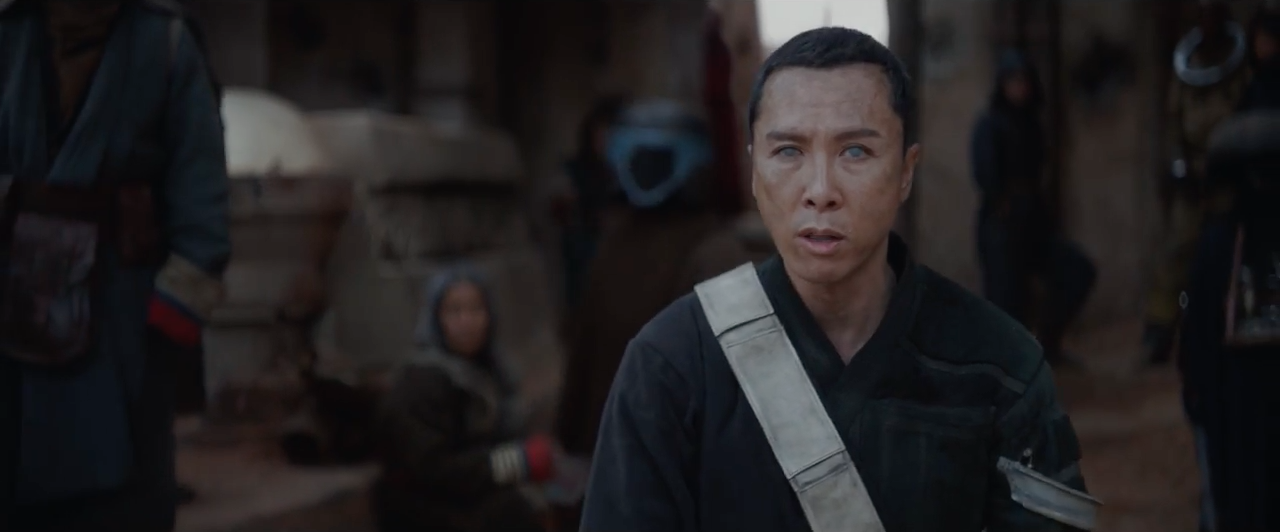 All of the characters introduced in this trailer look great, but the one I'm most excited about is the blind rebel Chirrut Imwe, played by Donnie Yen. He clearly understands the Force and maybe even knows how to use it declaring "I fear nothing, all is as the Force wills it." He then proceeds to beat the hell out of a team of Stormtroopers with only his staff. I hope he has a decent-sized role in the movie.
