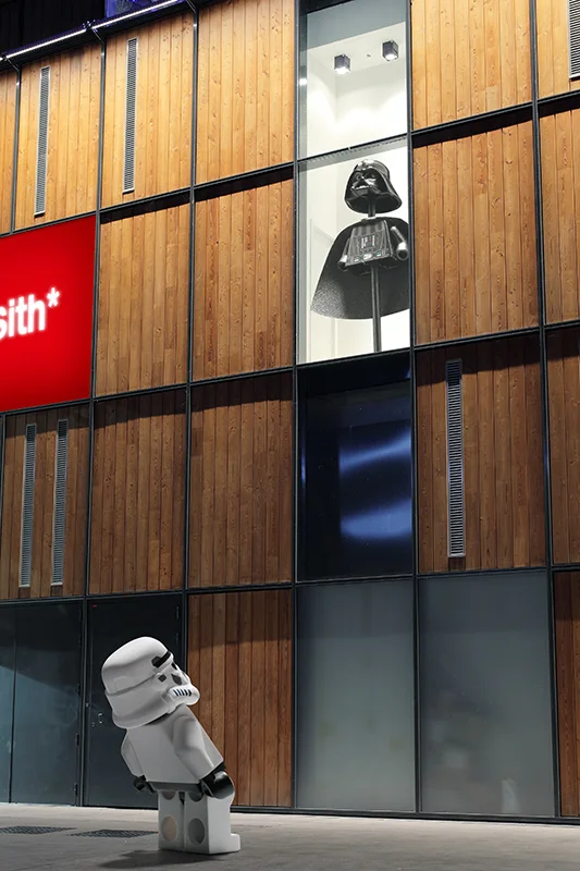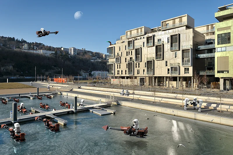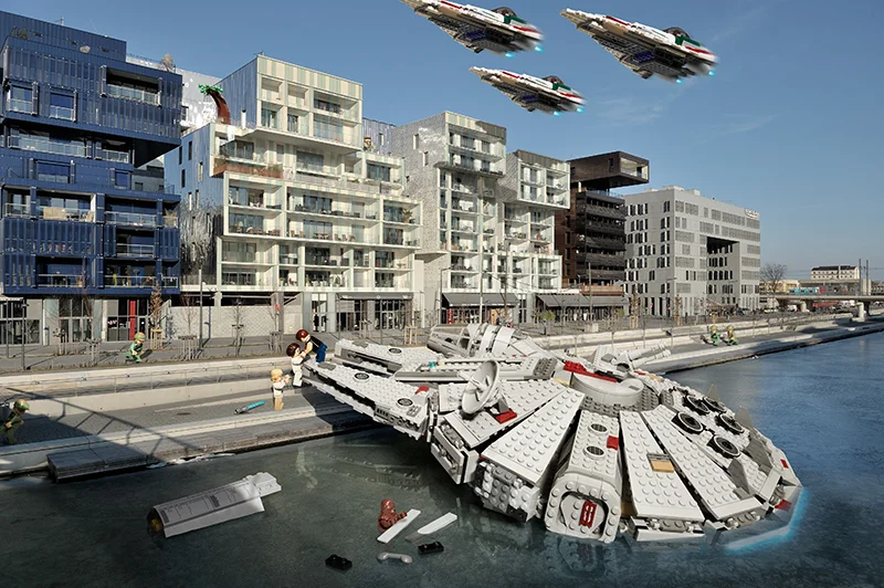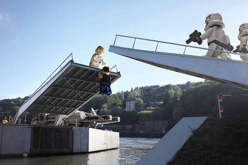A district in Lyon, France is overrun with Star Wars characters in photographer Benoit Lapray’s humorous LEGO photo series. The pictures show a crash-landed Millennium Falcon, battling Jedi, and the Empire both wreaking havoc and just lounging around. I particularly love the storefronts that were given Star Wars galaxy facelifts. Lapray’s photo series is called “Toy Invasion,” and it was done as a project for LEGO France. We’ve included some of our favorites below.