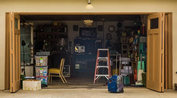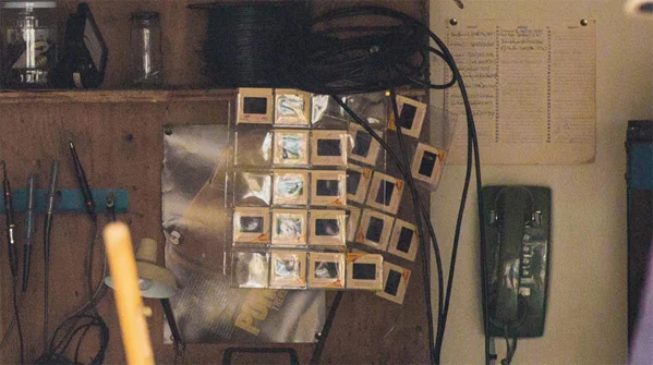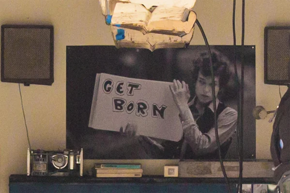 "Cinderblock and wood shelves are pieced together along the walls. Roller skates, a Thermos, an old vacuum cleaner and 8-track player and stereo lay haphazardly about. An advertisement for a Braun electric coffee maker hangs on the wall, as does a poster featuring Bob Dylan holding a 'Get Born' sign from a film clip featuring the song 'Subterranean Homesick Blues.' And the house itself has been painted a beige color with darker tan trim, contrasting with the formerly lighter exterior."