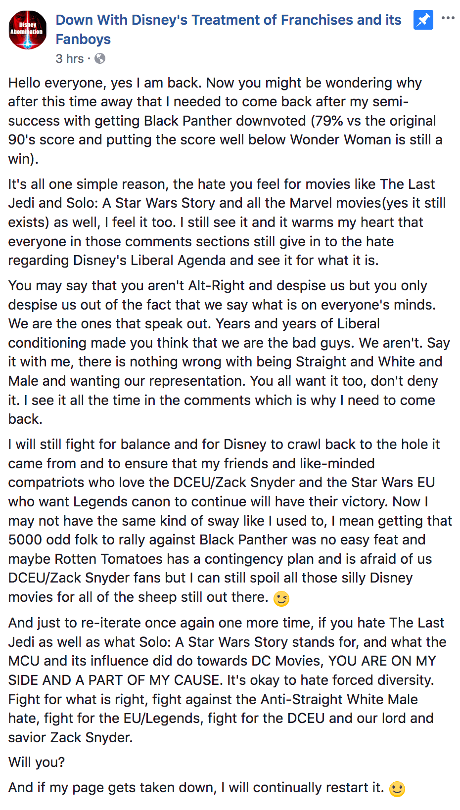 Below you can find a screenshot of the latest Facebook post which is a call to arms to take on "Disney’s Liberal Agenda" and what they see as a discrimination against straight, white men. The whole thing is absurd and it's going to be funny to see them fail all over again. It's actually pretty sad that they feel the need to do this. It's a shame that they don't know how to have a good time at the movies.