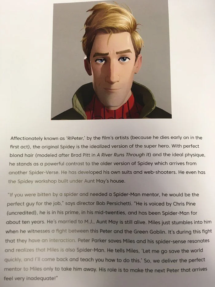 In Spider-Man: Into the Spider-Verse: The Art of the Movie, a small detail is revealed about Peter Parker. The artists for the film called him “RIPeter” because he dies in the first act.