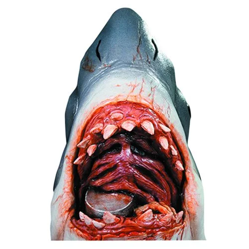 This mask was designed and sculpted by Mikey Rottela, and it awesomely captures the shark's final scene in the movie. It includes the scuba tank that was shot to blow up the shark. You can also see part of Quint’s hand in its mouth.