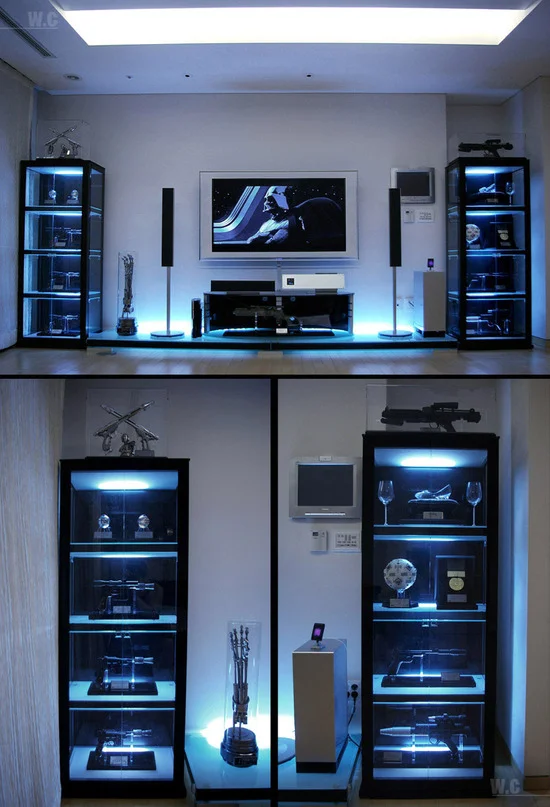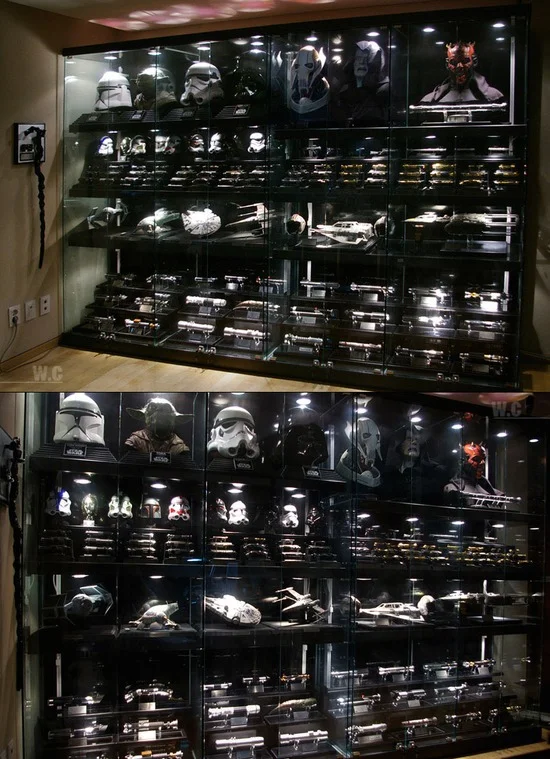 I've met some hardcore Star Wars fans in my life, but no one I know has taken their fandom to the extreme of Korean actor Cho Woong, who has decked out his apartment with enough action figures, toys, and replica weapons that it could basically double as a Star Wars gift shop if he wanted it to. From busts of Darth Maul to his own museum-style info station on the wall, Woong has one of the craziest set-ups I've seen in a personal living space. But here's a question: what's up with those Nightmare Before Christmas figures being mixed in with all of this Star Wars stuff? And is that a robotic arm from Terminator 2 on display, also? If you have this much Star Wars paraphernalia, why wouldn't you keep it pure and store that other stuff somewhere else?