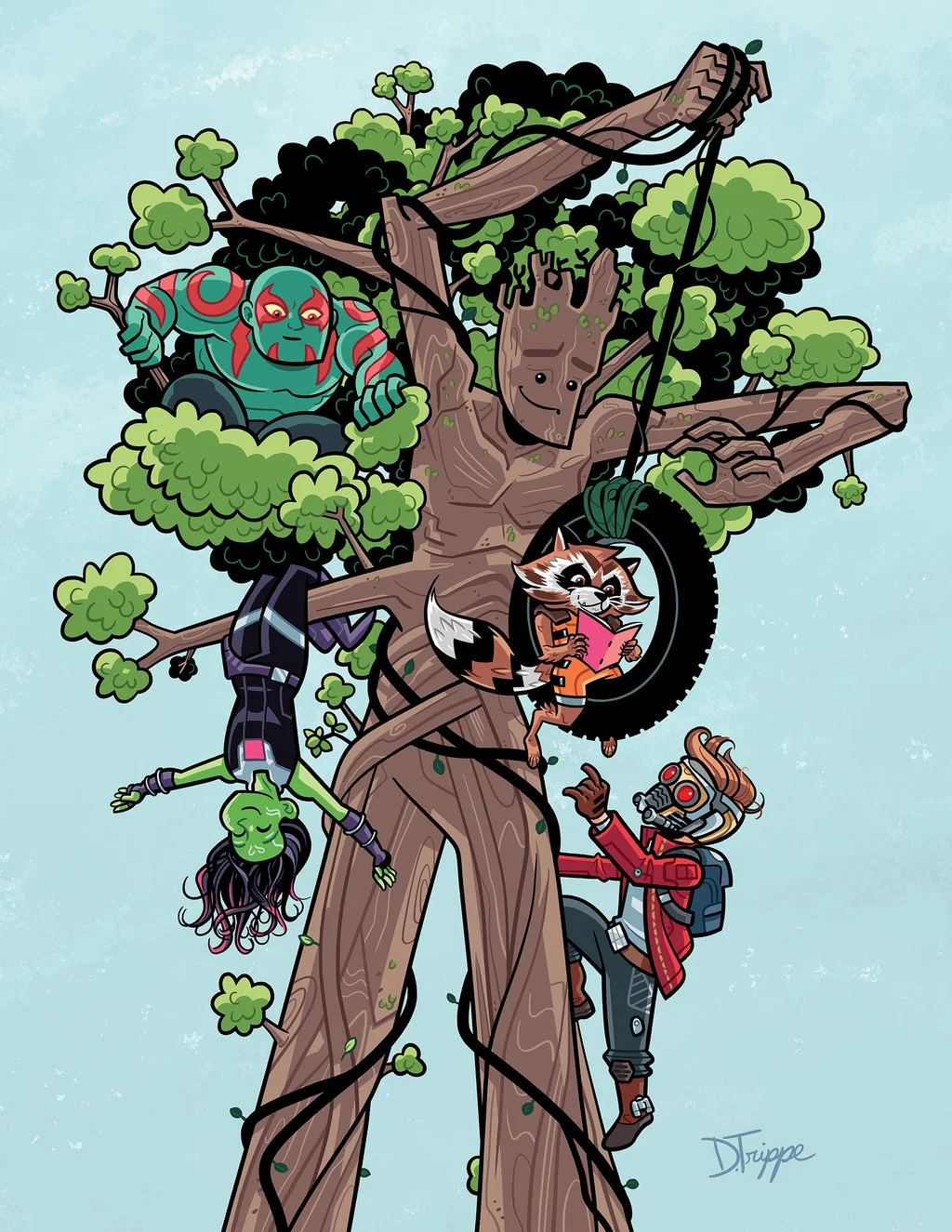 Who needs a custom swing set (though if someone wants to build me one of those I wouldn't object) when you have Groot to act as your personal treehouse? Artist Dean Trippe recently finished his quite adorable take on the Guardians of the Galaxy, and while its pretty easy to render most of the team in a lovable fashion, kudos to Trippe for creating the most delightful version of Drax I think I've ever seen. He just looks so happy. For that matter, so does Gamora.