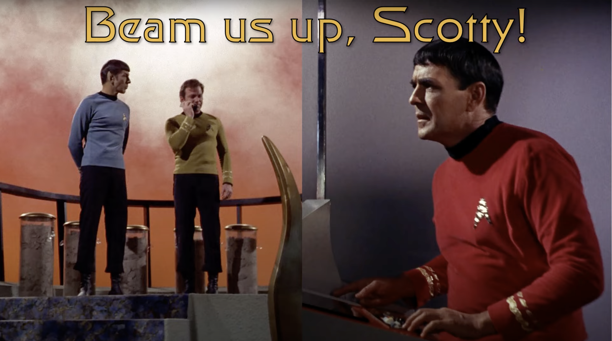 “Beam me up, Scotty!” This saying is commonly associated with Star Trek–but ironically, this exact phrase was never used in dialogue. However, there are many examples of very similar phrases in Star Trek (such as “beam us up”), which are documented in this video. Note: These examples are predominantly from TOS because, on later series, it would be more typical to hear a command along the lines of, “[number] to beam up.”
