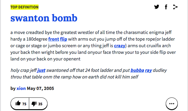 Over the years, the Swanton Bomb became one of Jeff Hardy’s most popular finishers. It’s difficult to do justice to his take on the move, so I’ll leave that to the eloquent top description of it on UrbanDictionary: