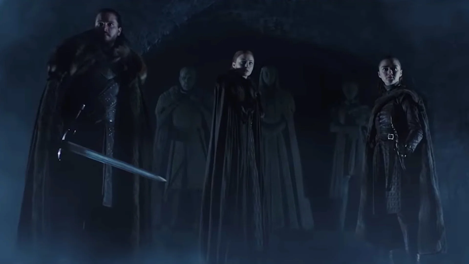 While it doesn’t show any actually footage from the season, it does feature the surviving members of the Stark family, Jon Snow, Sansa Stark and Arya Stark, confronting their legacy as they walk through a dark crypt filled with the statues their family.