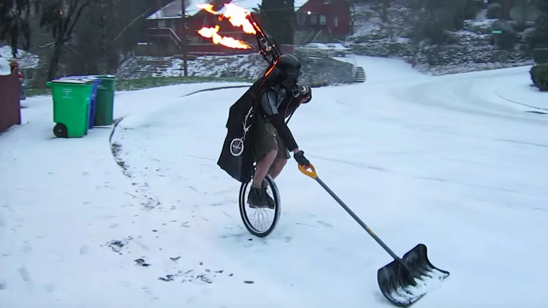 The Unipiper, aka Portland's Brian Kidd, is well-known for his schtick in which he dresses up as a pop culture character, precariously balances on an object (whether it's a ball or a unicycle), and glides around playing flaming bagpipes. He's dressed as Darth Vader twice before — once for The Force Awakens and once for Rogue One — but aside from the general joy he brings to society and the internet at large with his antics, he's added another benefit to his performance: shoveling snow. Granted, he doesn't actually shovel all that much, but I doubt I could do any better in those circumstances. (I also like that he's wearing shorts. It adds to the ridiculousness of the whole scene.)