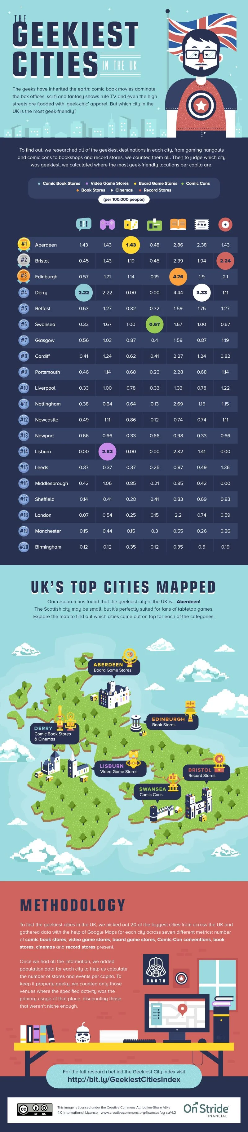 Are you a geek in the United Kingdom? Well, you may want to hang out with some other geeks and thanks to the finance blog Onward, you can now know the best places in the UK to meet geeks of similar interests. The blog looked at 20 of the biggest cities in the UK and looked at how friendly they were to different kinds of geeks. The categories of geeks were comic book, video game, board game, convention, book, movie, and music/record geek. They looked at how many hotspots for each category (such as a comic book store, game store, convention, theater, etc.) and put that per 100,000 people. You can check out the infographics below, but the gist is the following list of which cities reign supreme for each category: