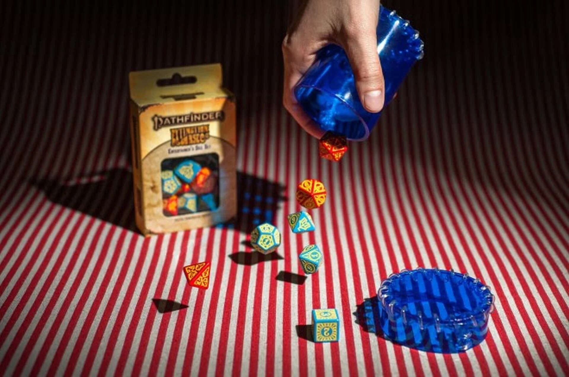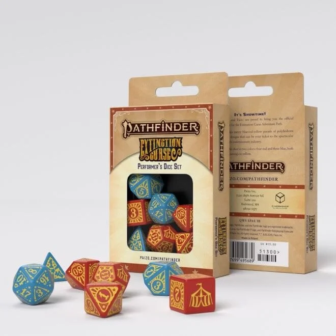 If you like playing either Pathfinder or Starfinder from Paizo, Q Workshop has revealed some awesome official dice sets. Each set comes with seven plastic polyhedral dice (d4, d6, d8, d10, d100, d12, d20) with precision engravings. Two of the sets are for Pathfinder’s Extinction Curse Adventure Path and features red and blue dice with yellow painting. The Performer’s set features a blue d20, d10, and d4 while the Entertainer’s set features those same dice in red.