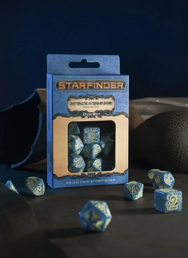 The first set of dice for Starfinder are for the Attack of the Swarm! Adventure path. These dice are glacier blue with “cloudy admixture that resembles mist covering dangers, emerging out of the blue.” To make things even cooler, the pale yellow markings are designed to look like insects and larvae, all too fitting for the adventure.