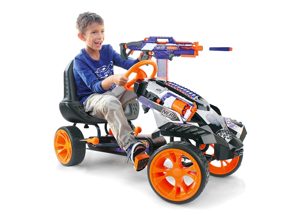 Where they hell was this thing when I was a kid?! This is Hauck Toys’ Nerf Battle Racer go-kart, which, as you can see, is packed full of foam firepower. The pedal-powered go-kart has several mounts and posters to hold your Nerf gun arsenal.