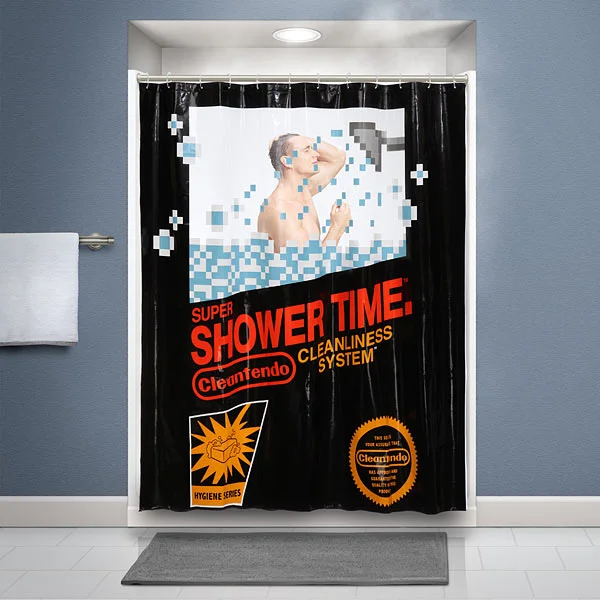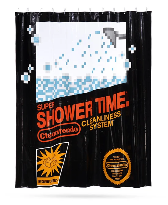 ThinkGeek has a cool retro gaming shower curtain for sale that makes it appear as if you're on the front cover of a classic Nintendo cartridge when you're showering. It'll set you back $24.99, which seems pretty reasonable.