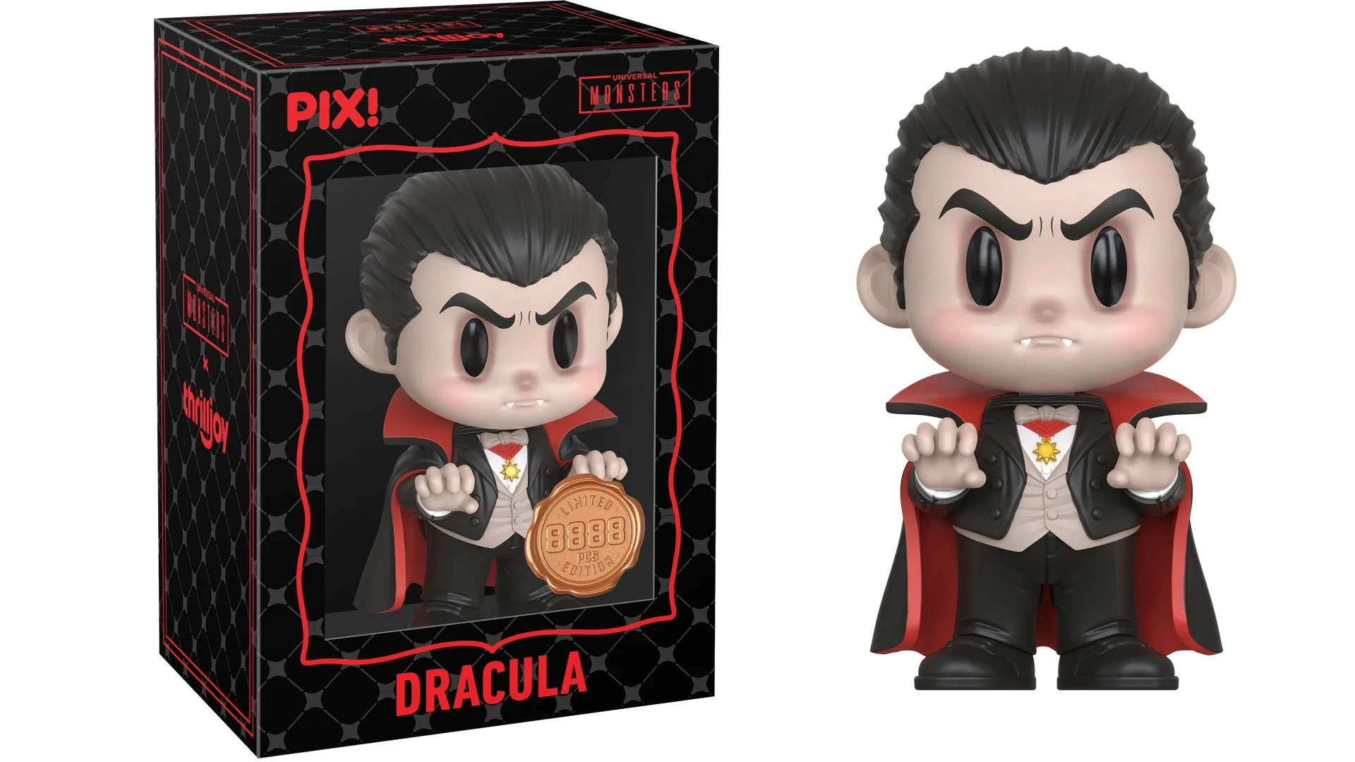 “Thrilljoy is so excited to announce the all-new Dracula PIX! launching on November 7th! This PIX! has the chance to uncover one of three monsters! The Hero Edition (LE 8,888) features Dracula in his signature outfit. The 1-in-6 Chase features Wolfman holding his iconic wolf-head cane!