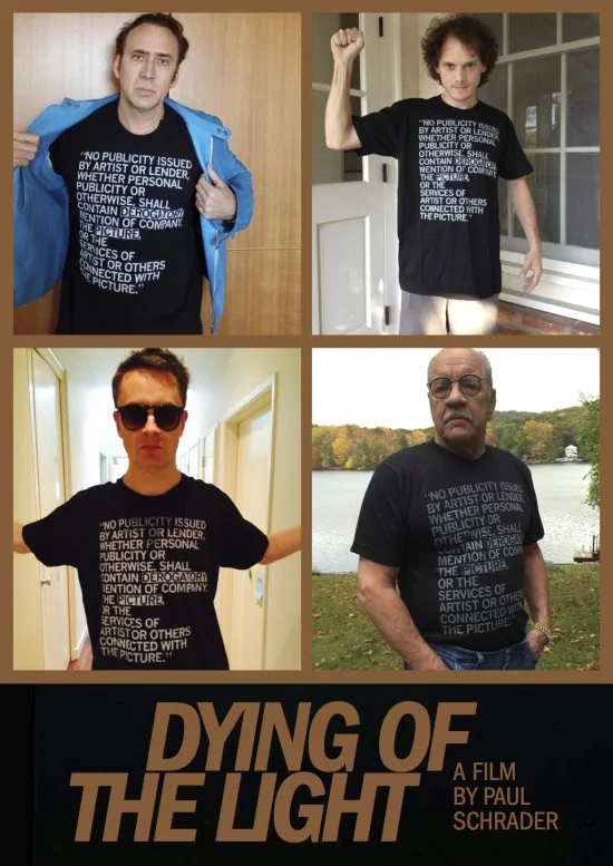 We lost the battle. Dying of the Light, a film I wrote and directed, was taken away from me, redited[sic], scored and mixed without my imput[sic]. Yesterday Grindstone (a division of Lionsgate) released the poster and the trailer. They are available on line[sic]. Here we are, Nick Cage, Anton Yelchin, Nic Refn and myself, wearing our “non-disparagement” T shirts. The non-disparagement clause in an artist’s contract gives the owners of the film the right to sue the artist should the owner deem anything the artist has said about the film to be “derogatory.” I have no comment on the film or others connected with the picture.