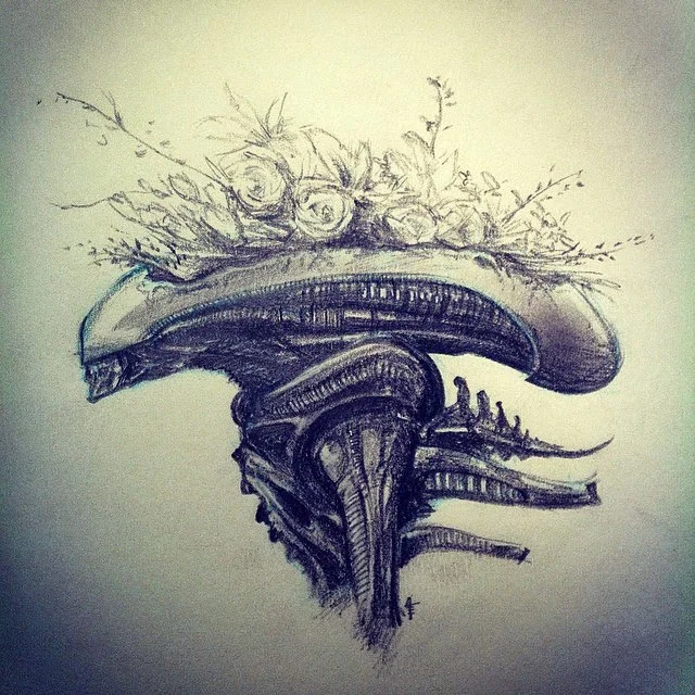As a tribute to artist H.R. Giger, Javi Recio created the sketch above featuring the Giger drawing the Xenomorph alien that helped make him famous. I've included more art from different artists below. The artist passed away on Monday after suffering a fall in his museum. I've been a huge fan of his art since I was a teenager. I worked for an illustrator at the time, and he's the one that introduced me to the artist along with several others.