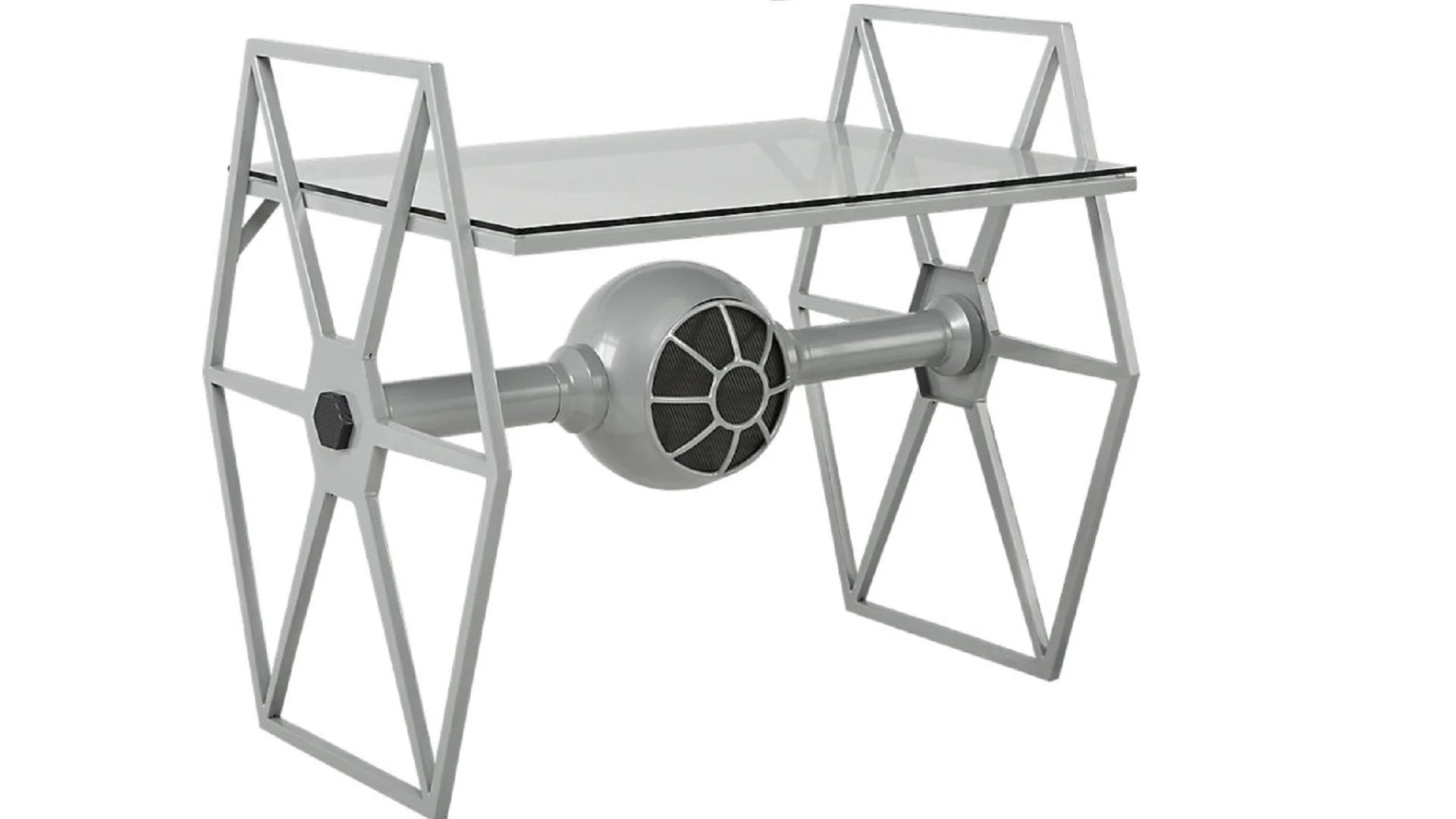 Get in the creative spirit with the Star Wars inspired TIE fighter™ desk. Known throughout the galaxy as the sentry ships of choice for the Death Star™, the solidly constructed base has a gray finish and powder coated steel construction that features "carbonite" textured details. The clear tempered glass top is sunken, creating two sides that will keep projects on the desk and off the floor.