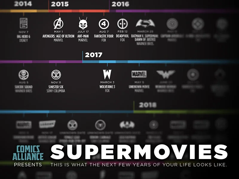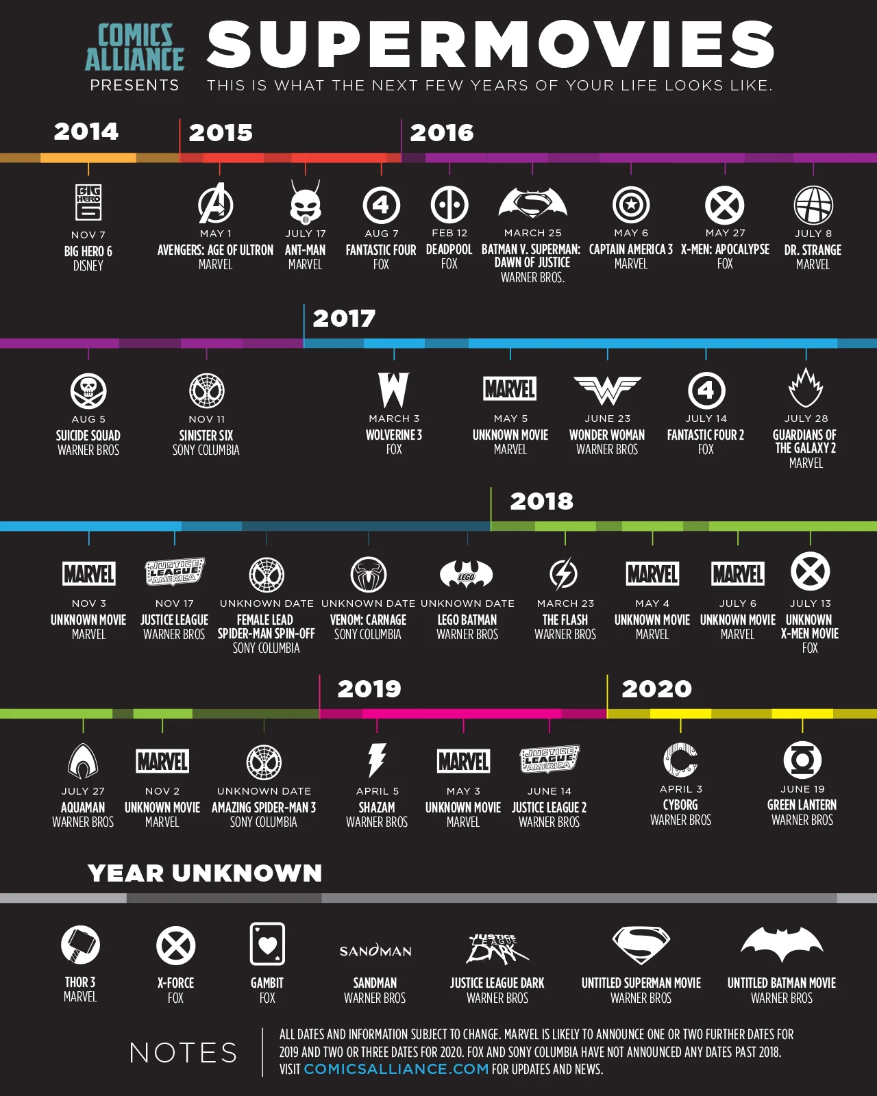 Graphic artist Dylan Todd (in collaboration with Comics Alliance) has created "Supermovies," an infographic that gives a helpful look at all known superhero movies coming out over the next six years and beyond. All the dates are referenced in detail at Comics Alliance.