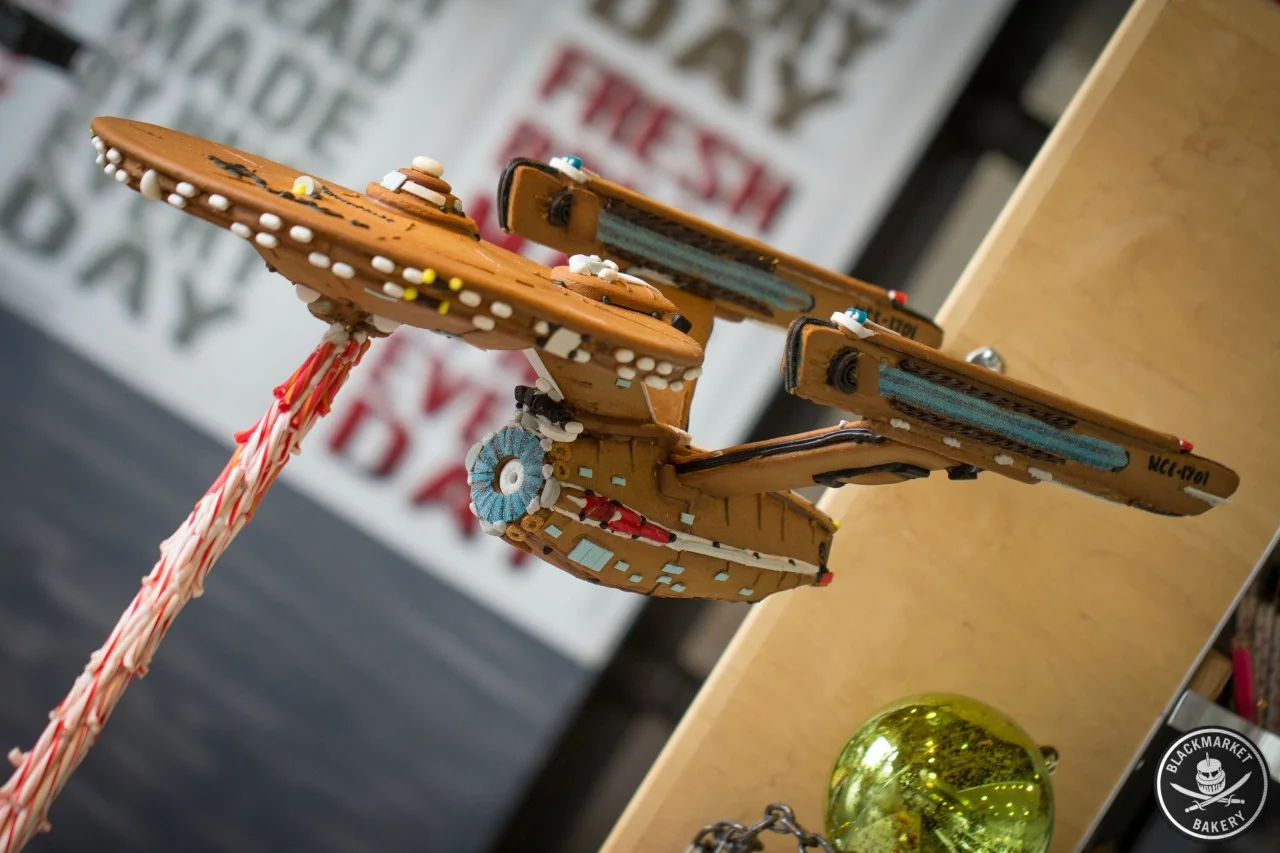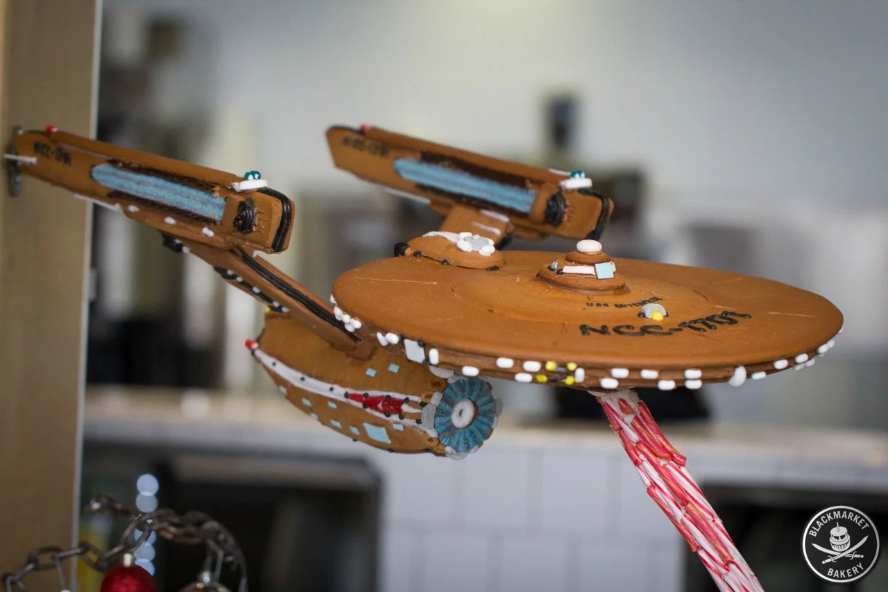 I’ve never been a big fan of gingerbread, but I’ve gotta admit this gingerbread model of the U.S.S. Enterprise from Star Trek is pretty incredible. I’m really impressed with the detail, and it’s definitely the coolest thing made out of gingerbread that I’ve seen. The starship is on display at the Blackmarket Bakery in Costa Mesa, California.