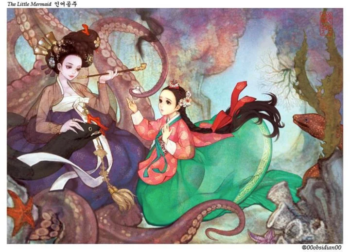 Korean artist Na Young Wu’s manga style illustrations of characters in Western folktales wearing hanbok (traditional Korean formal wear) made the rounds on the Internet this past weekend. All of the photos I came across were really low resolution. So I went on a search for the largest versions of each image. Luckily, I just so happen to speak Korean, so I was able to navigate through random sites and forums on Naver (South Korea’s answer to Google) to find many of these hi-res images. I’ve provided the largest resolution files I could find, and came across a few other illustrations from the artist that I didn’t see on other sites.